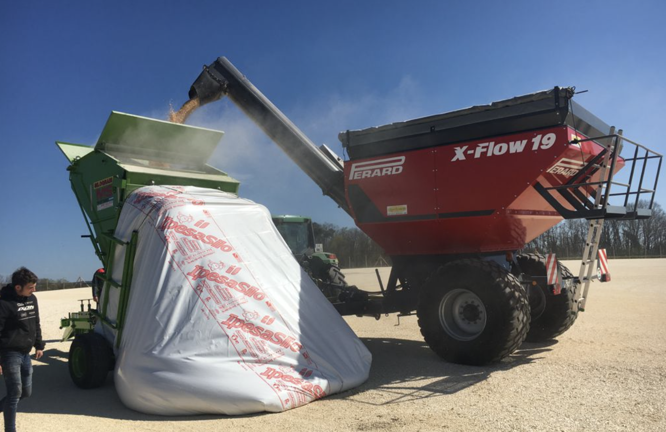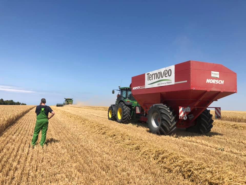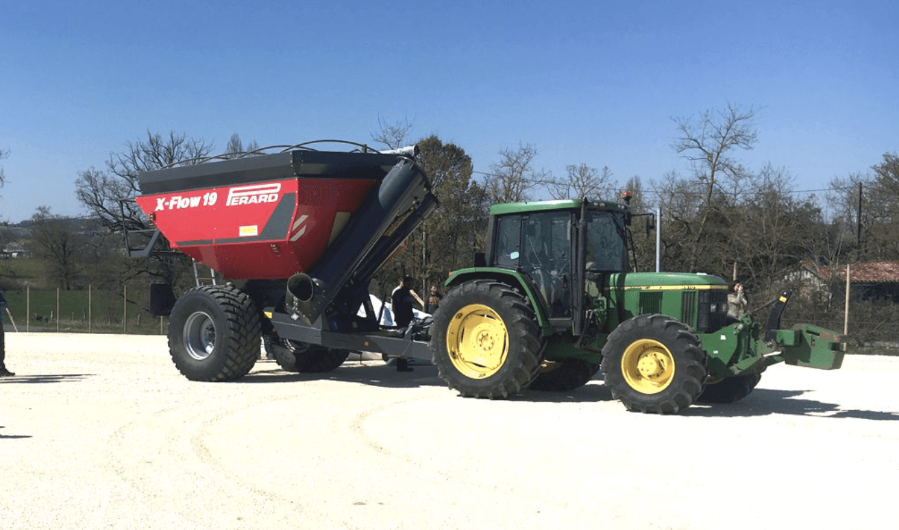 Le principe : Ne pas arrêter de travail de la moissonneuse. Le chauffeur n’a pas d’autre préoccupation que de récolter, et prévenir quand la trémie est presque pleine. A ce moment là, le chauffeur du transbordeur arrive et remplit en marche